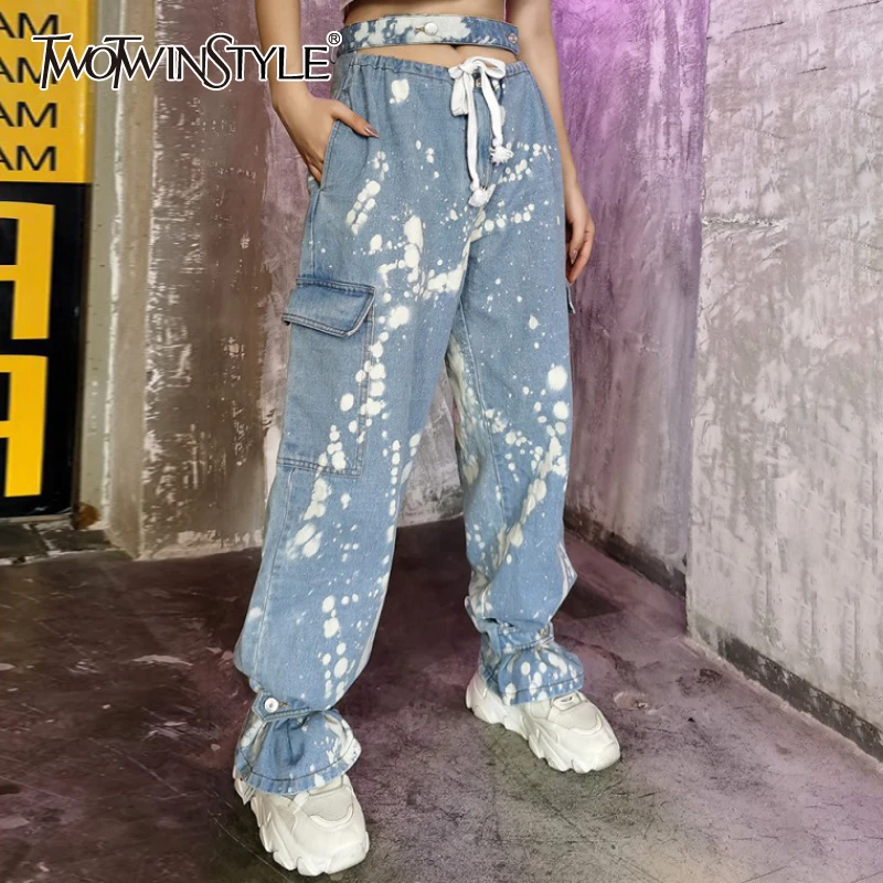 Twotwinstyle Casual Print Tie Dye Jeans For Women High Waist Hollow Out Loose Hit Color Denim Pants Female Fashion New Clothing Jeans Aliexpress
